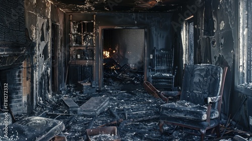 © ds17, Naklejka premium A burned interior of a house shows charred walls, blackened furniture, and debris scattered on the floor. The scene conveys the aftermath of a fire disaster.