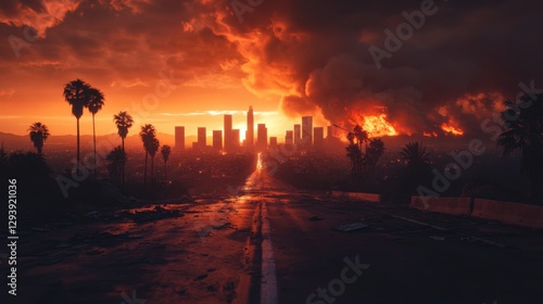 © Алена Ваторина, Obraz premium A burning city skyline under a fiery sunset, with smoke and flames engulfing the horizon as an empty road leads into destruction