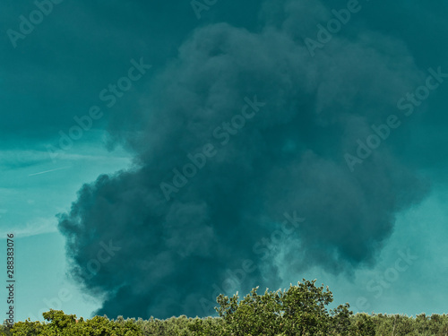© catherinelprod, Fototapeta premium A Burning plastic recycling place causes a big pile of dark, black thick smoke on a sky blue summer day. Danger, sorrow. Terrorist attack or explosion.