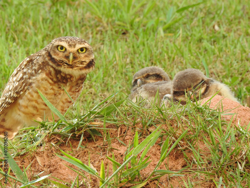 Naklejka premium A burrowing owl, attentive, watching over its two sleeping cubs. Big yellow...