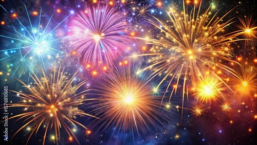 © Praphunsak, Naklejka premium A burst of glittering fireworks exploding in the sky with a vibrant display of colorful sparks on a dark and starry background