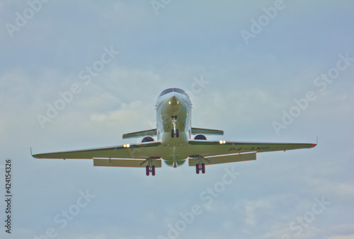 © Akeksey, Obraz premium A business jet airliner is landing at sunset