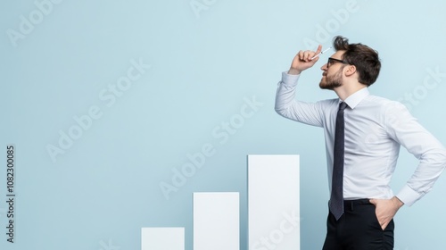 © Prompt2image, Fototapeta premium A business professional stands confidently in a stylish office, contemplating strategies for success while pointing at a growth chart on the wall