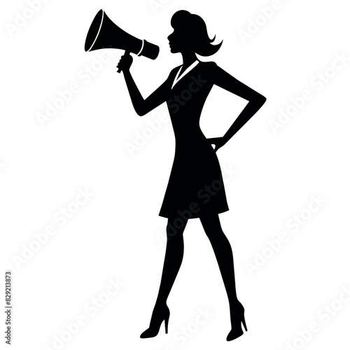 © Dream Is Power, Fototapeta premium A business woman standing with megaphone for loudly speaking for advertisement vector silhouette, white background