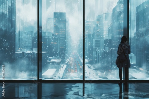 Fototapeta premium A business women dressed in formal clothes in front of a floor-to-ceiling window in an office architecture cityscape building.