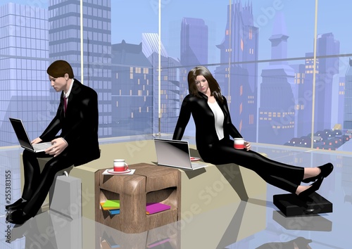 © ilonareny, Fototapeta premium a businessman and a businesswoman sitting in a room with their notebooks, relaxing and working, like in a waiting room, 3D illustration, raster illustration