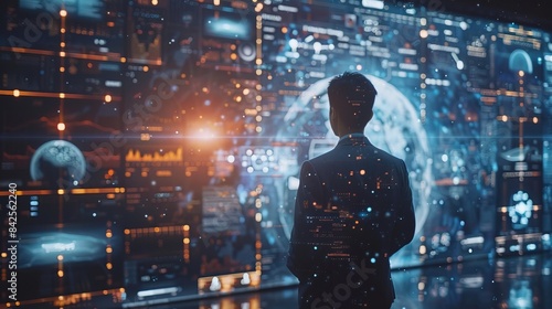© MochSjamsul, Fototapeta premium A businessman collaborates with AI algorithms, fostering innovation in a high-tech environment to stay ahead, virtual screen blend