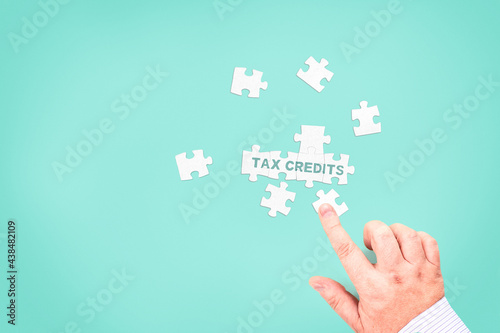 Fototapeta premium A businessman collects the text "Tax credits" from puzzle pieces