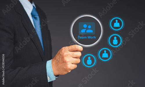 Fototapeta premium A businessman holding a magnifying glass looks for teamwork for the...
