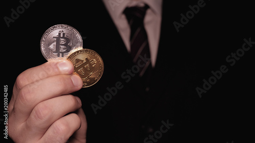 © dkHDvideo, Fototapeta premium A businessman in a suit holds in his hand a gold and silver bitcoin, a black background, a crypto currency, a course.