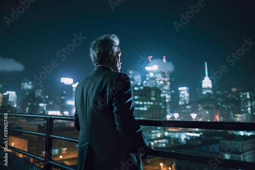 Fototapeta premium A businessman in a suit stands on top of a skyscraper on a blurred cyberpunk futuristic city panorama background with bright neon lights. Photorealistic Generative AI illustration.