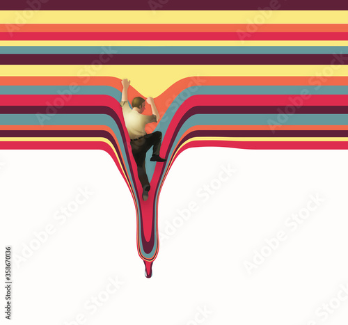 © Rob Goebel, Naklejka premium A businessman struggles to climb up a ladder of fluid and slippery colored bars.