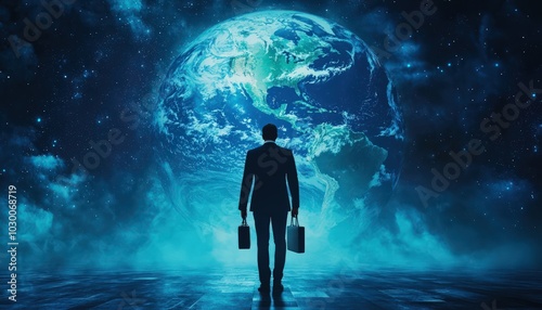 Fototapeta premium A businessman with a briefcase stands before a globe, symbolizing...