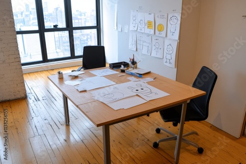 Fototapeta premium A bustling animation studio, with artists sketching characters and scenes, storyboards pinned on the walls
