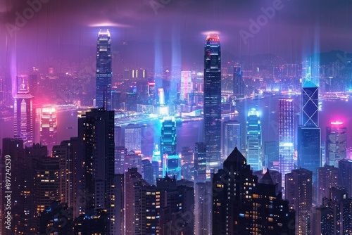 © Ifti Digital, Obraz premium A bustling city at night, with an array of lights illuminating the streets and buildings, Innovative building construction fused with a future city skyline, AI Generated