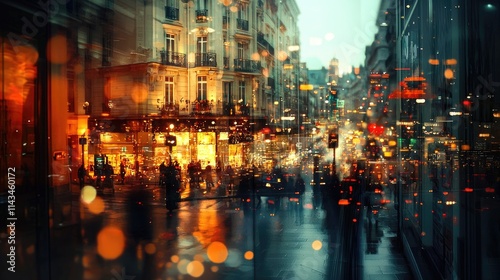 © kwanchaift, Obraz premium A bustling cityscape at dusk, where the bright lights of the buildings blend with the fading light, forming a surreal double exposure effect.