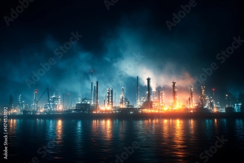 Naklejka premium A bustling industrial site is lit up at night with bright flames and glowing structures. Dark smoke billows into the sky, reflecting on the water's surface
