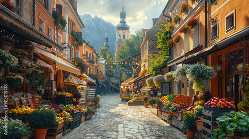 © mia.n_official, Fototapeta premium A bustling market street in an old European town