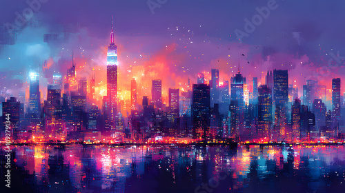 Obraz premium A Bustling Nighttime Cityscape Bursting with Vibrant Colors and Animated...