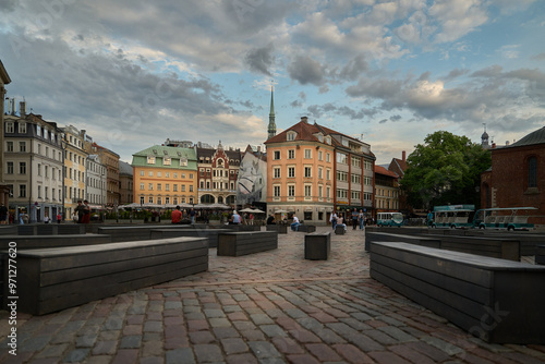 © JK, Fototapeta premium A bustling scene unfolds in Riga's iconic Dome Square, featuring historic buildings, a charming statue, and locals enjoying the lively atmosphere.