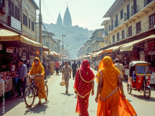 Obraz premium A bustling street market showcases traditional architecture, vibrant clothing, and daily life, as people walk among stalls under the clear sky and iconic landmarks in background.