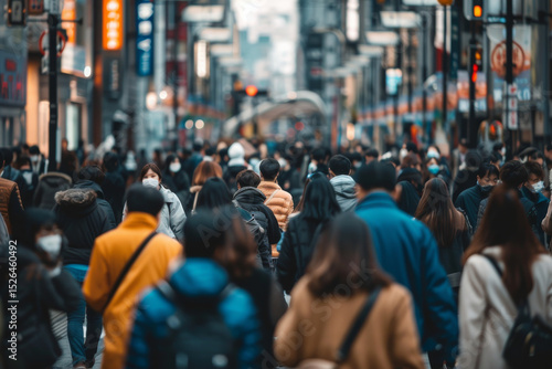 Fototapeta premium A bustling street scene with a crowd of people walking, focus on diverse...