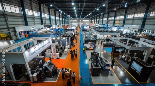 © Dni497 Studio, Naklejka premium A bustling trade show or convention center with various exhibits and attendees walking through vibrant, well-organized booths.