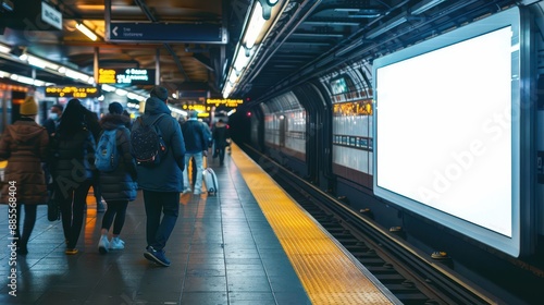 © Fokasu Art, Fototapeta premium A bustling train station platform during rush hour features a vertical blank white screen billboard mock-up. full ultra HD, high resolution.