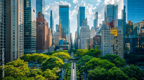 Obraz premium A bustling urban area with green rooftops and gardens.
