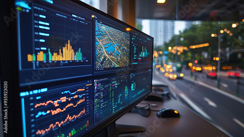 Fototapeta premium A bustling urban skyline reflects innovation as data analytics visualize trends during twilight in a modern office space