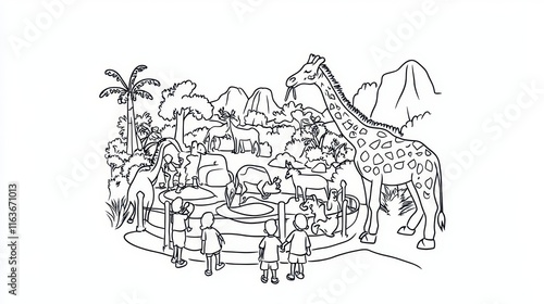 Fototapeta premium A bustling zoo coloring book page featuring families visiting animals like giraffes, lions, and penguins in their enclosures. Add zookeepers feeding animals and intricate details on the animal