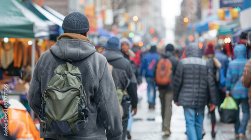 © khonkangrua, Fototapeta premium A busy city street with a crowd of people walking, capturing the hustle and bustle of urban life in winter.