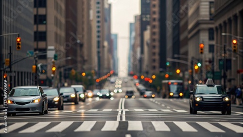 Fototapeta premium A busy city street with cars and traffic lights creates a dynamic urban...