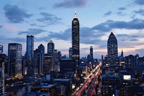 © Muhammad, Fototapeta premium A busy cityscape at dusk with skyscrapers lit up and traffic streaks on the streets below.