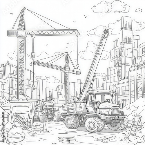 Obraz premium A busy construction site with heavy machinery, coloring page for kids, simple...