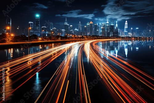 Obraz premium A busy highway at night, trails of light from the moving vehicles creating a...