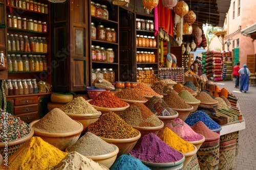 Fototapeta premium A busy market street in Marrakech complete with vibrant spices and textiles