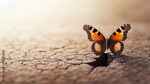 Obraz premium A butterfly emerging from a hole in a barren landscape. Surrealistic image for metaphor.