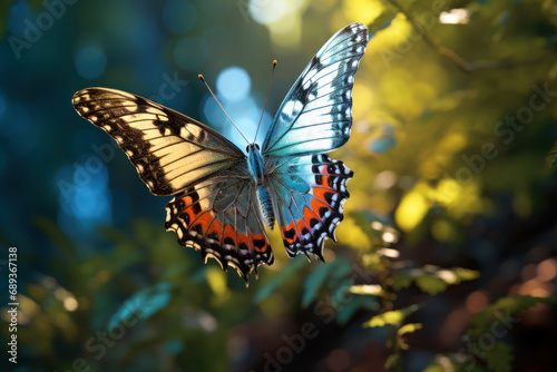 Fototapeta premium A butterfly in flight, leaving a trail of colorful patterns, portraying the...