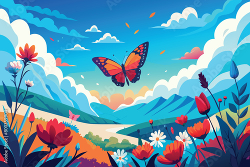 © GMZ, Obraz premium A butterfly is flying over a field of flowers