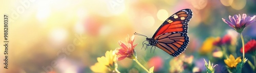 © ZeeZaa, Fototapeta premium A butterfly is flying over a field of flowers