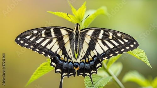 © Ghiska, Fototapeta premium A butterfly is sitting on a leaf. Generate AI