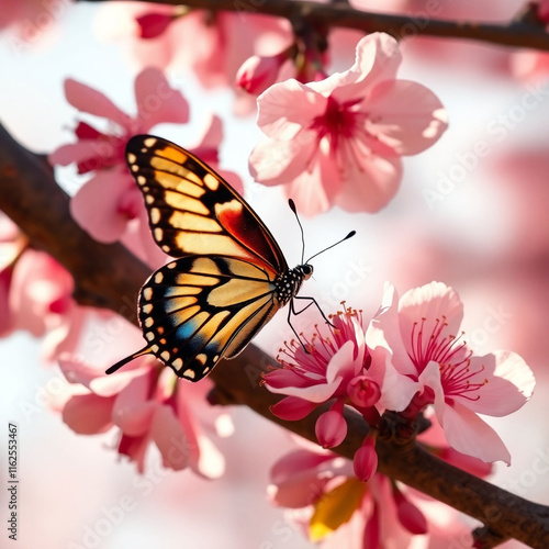 Fototapeta premium A butterfly landing on a blooming cherry branch