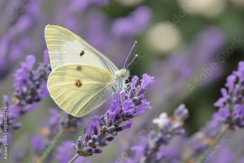 Naklejka premium A butterfly landing on lavender, shallow depth of field, soft afternoon lighting