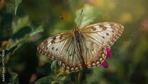 Obraz premium A butterfly perched on a pink flower with green foliage background.