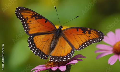 Fototapeta premium A butterfly perched on the center of a bright pink flower, surrounded by...