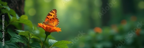 Obraz premium A butterfly perches on a bright orange flower among dense forest foliage,...