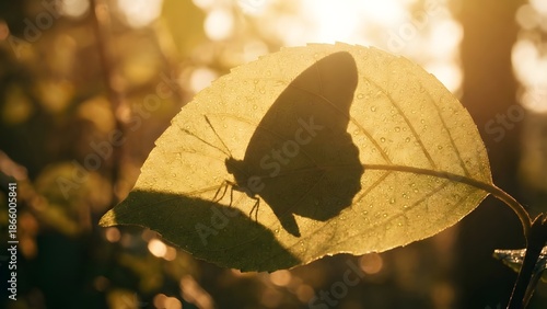 © karonaro, Obraz premium A butterfly resting on a leaf in a serene forest environment at sunrise