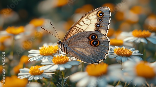 © Рудой Максим, Obraz premium A butterfly resting on vibrant flowers in a sunlit garden during springtime