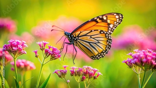 Naklejka premium A butterfly's delicate wings grace a vibrant pink flower, nestled in lush...